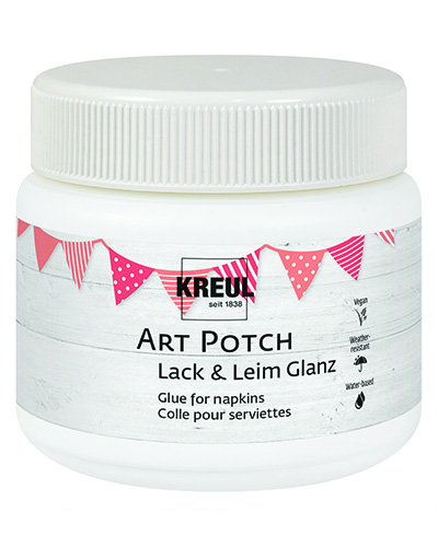 Kiiltävä koristelu lautasliinatekniikallaHaluatko koristella esineitä paperiserviettien kuvioilla? Se käy helposti KREUL Art Potch Gloss -liima & lakan avulla. Tämä erityisliima toimii sekä liimana että lakkana samassa tuotteessa, joten tarvitset vain yhden aineen kuvioiden kiinnittämiseen ja päällystämiseen. Lopputuloksena saat tyylikkään, kiiltävän pinnan, sillä liima kuivuu kauniin kiiltäväksi. Eleganttia, kätevää ja kestävää – tuotepakkaukset on valmistettu kierrätysmuovista.OminaisuudetKiiltävä liima ja lakka lautasliinatekniikkaanVesipohjainenVegaaninenKuivuu läpinäkyväksiSäänkestäväMärät liimatahrat voidaan pestä lämpimällä vedelläKäyttöohje: Levitä ohut kerros potchia koristeltavaan esineeseen. Aseta lautasliinan ylin painettu kerros liiman päälle ja sivele potchia sen yli.Purkin muovista 40 % ja kannesta 96 % on kierrätysmateriaalia.